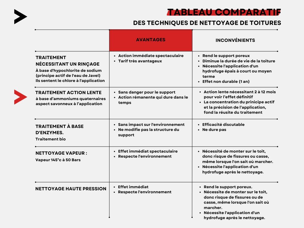 Notre Avis : Le nettoyage vapeur est une vrai solution sous réserve de faire appel à un professionnel équipé d'une nacelle. Il faut éviter, tant que possible, de monter sur une toiture de plus de 5 ans. Le vent, la pluie, le soleil et le gel rende fragile les supports. à l'exception de la brique béton peinte, monter sur un toit est proscrit pour faire un entretien respectueux.